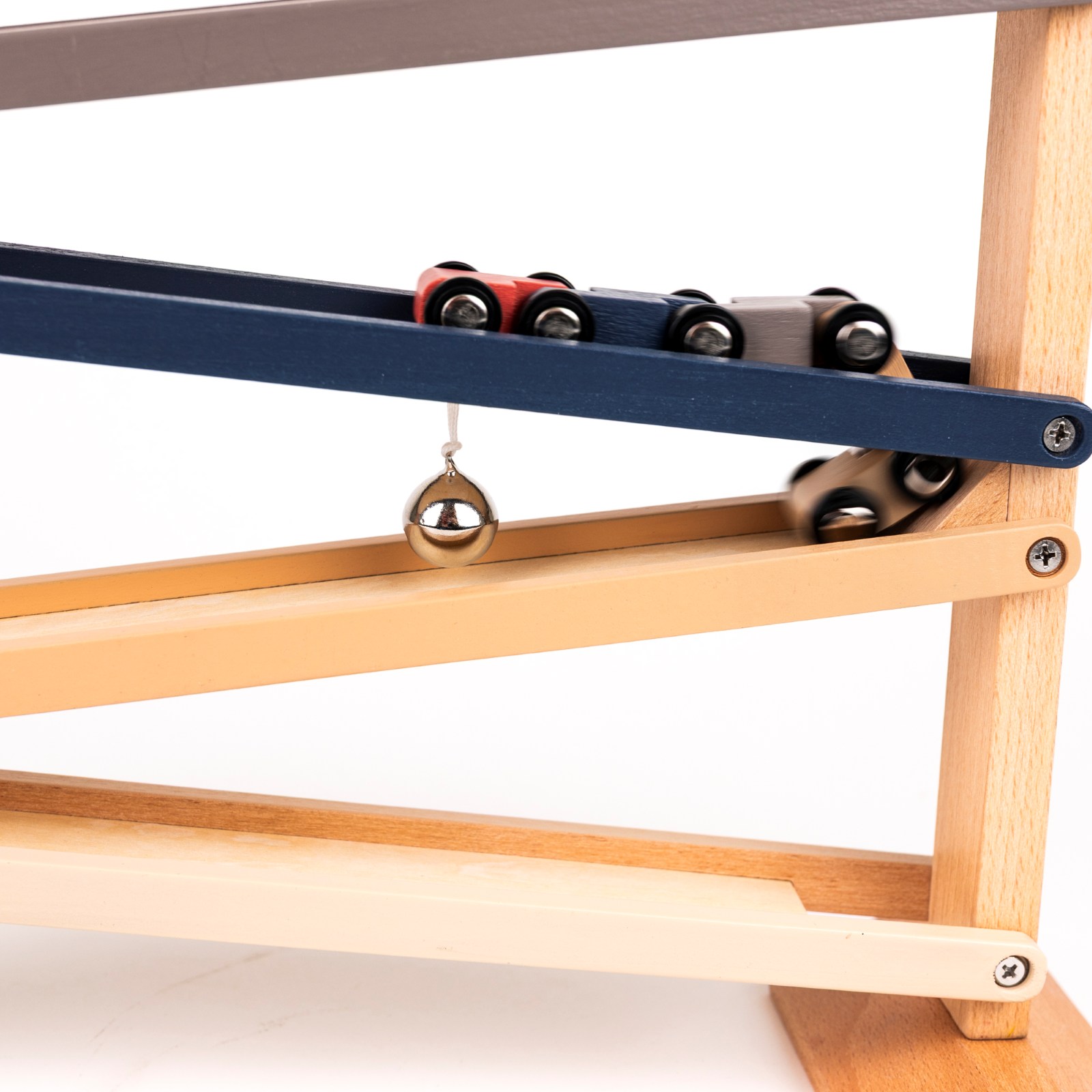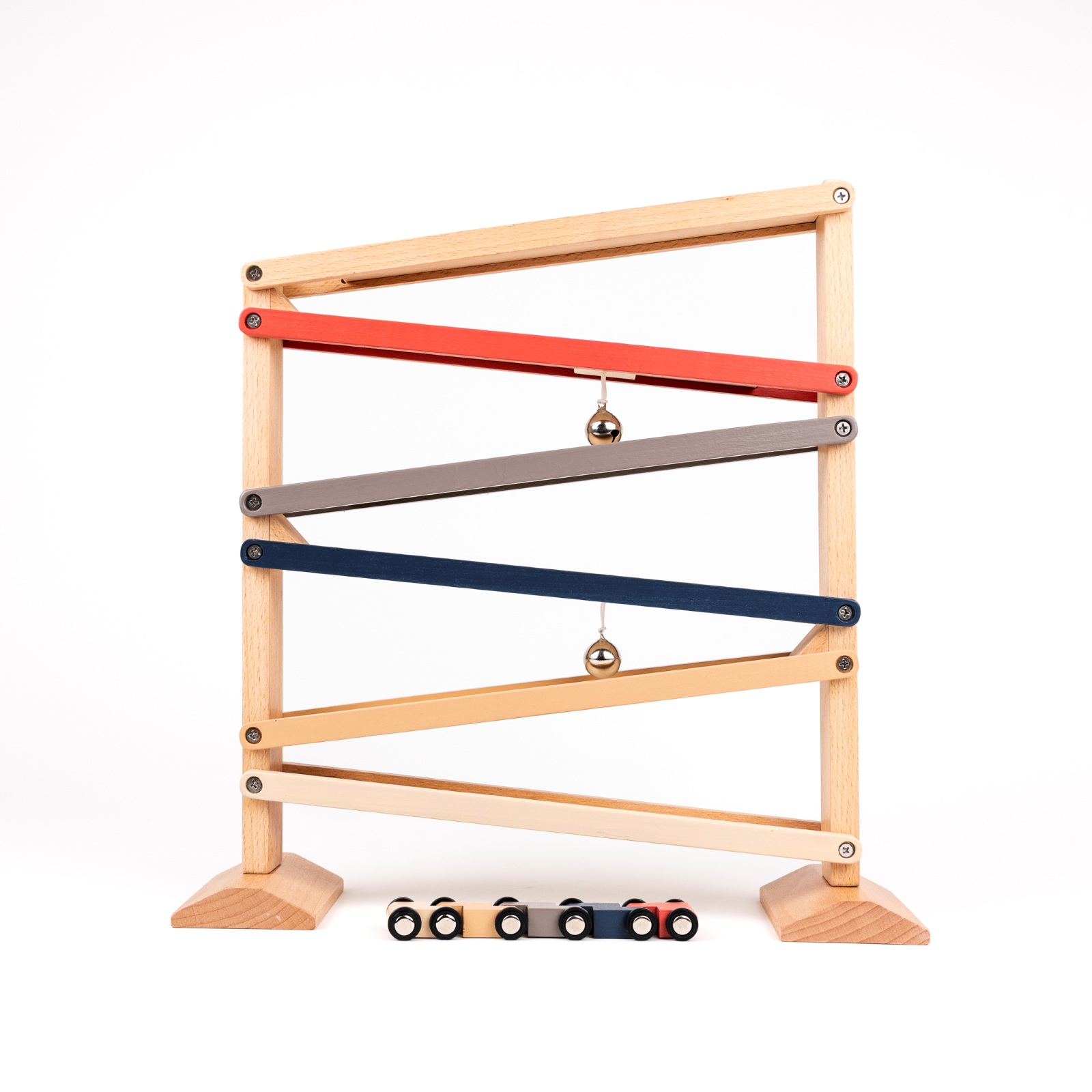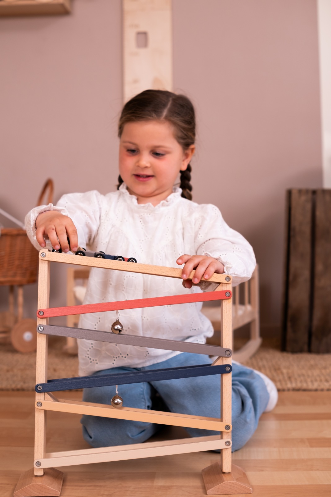 Auf die Plätze, fertig, los! Sieh zu, wie die kleinen Holzautos die bunten Rampen hinunter sausen, eine Ebene nach der anderen, und dabei eine fröhliche Glocke läuten. Dieses klassische Holzrutschenspiel ist perfekt für neugierige Kleinkinder und fördert die Hand-Augen-Koordination, das visuelle Verfolgen und den Sinn für Ursache und Wirkung. Mit seinem Holzrahmen und dem eleganten Design ist es ein zeitloses Spielzeug, das sowohl beim Spielen als auch bei der Einrichtung Freude bereitet. Enthält vier Autos in sanften Retro-Farben. Ab 18 Monaten, VE 1 Stk.