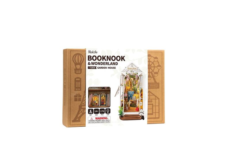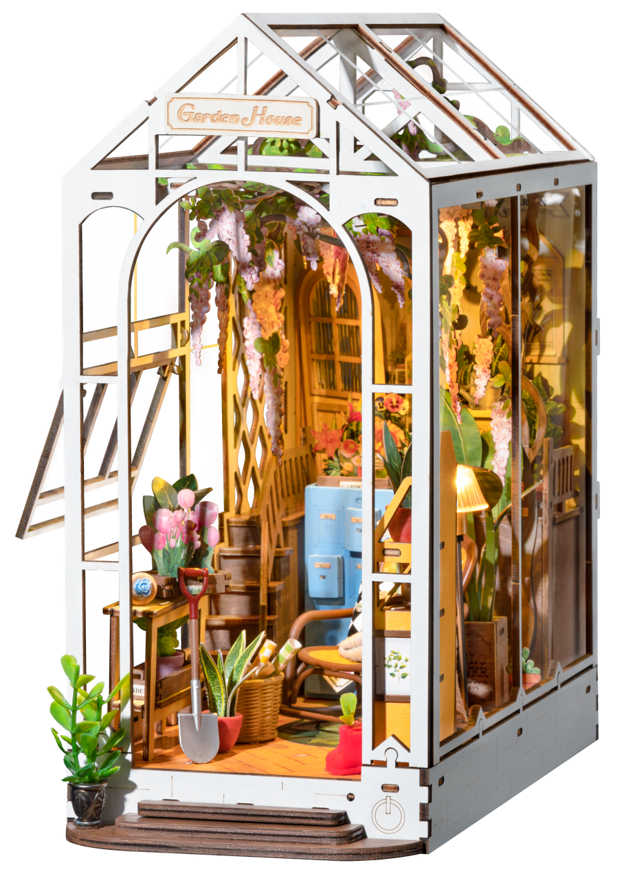 Ein Gartenhaus mit unzähligem Zubehör, als Bücherstütze geeignet, LED-Beleuchtung, riesiger Bastelspass, Alter 14+, aufgebaut 20,3 x 11 x 24,1 cm, 176 Holzteile. VE 1 Stk.