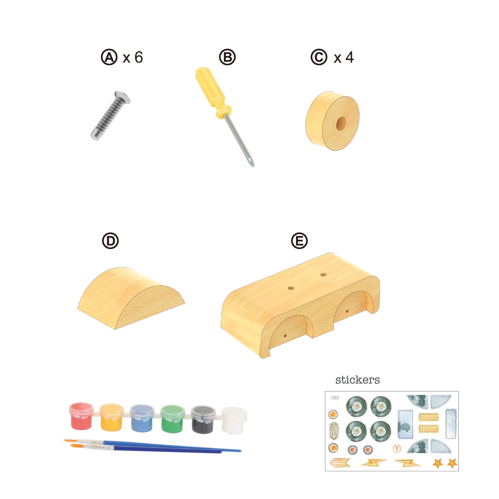 Zusammenbauen, bemalen und dekorieren. Folge der Anleitung und baue ein Auto aus Holz. Holzteile, Schraubenzieher, Farbe, Pinsel und Aufkleber. Alles ist im Lieferumfang enthalten. 10 x 6 x 6 cm, 6+, VE 2 Stk.