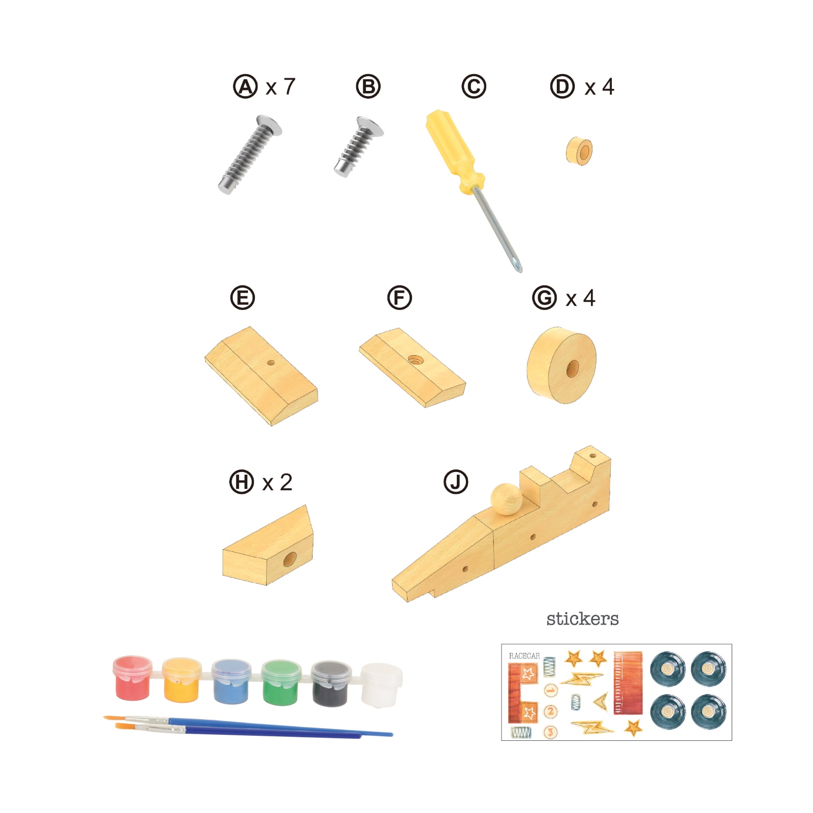 Zusammenbauen, bemalen und dekorieren. Folge der Anleitung und baue einen Rennwagen aus Holz. Holzteile, Schraubenzieher, Farbe, Pinsel und Aufkleber. Alles ist im Lieferumfang enthalten. 13 x 5 x 5 cm, 6+, VE 2 Stk.