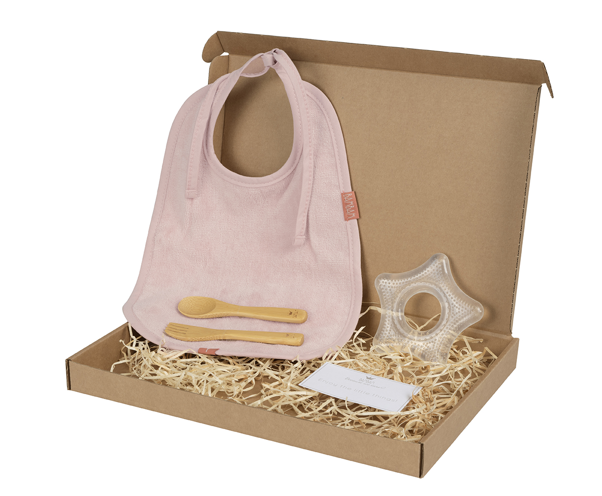 Diese Box ist gefüllt mit einem rosaroten Lätzchen aus schöner Bio-Baumwolle, einem Besteck aus Bambus und einem weichen Beißring aus BPA-freiem Material. VE 1 Stk.