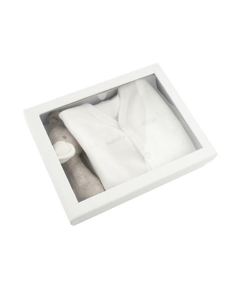 Geschenkset Schlafen mit Strampler weiss Grösse 50/56 und Enten-Rassel grau, Geschenksverpackung6.5 VE: 3