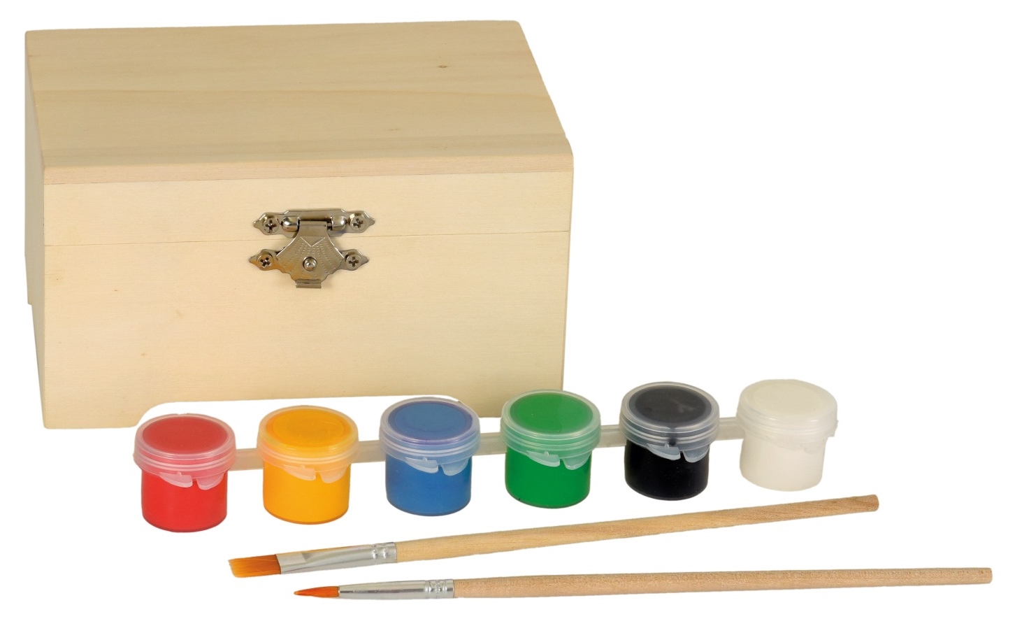 Eine niedliche kleine Schatzkiste aus Holz, 2 Pinsel und Farbe, um sie nach deinen Vorstellungen zu bemalen. 13 x 9 x 7 cm, 3+, VE 2 Stk.