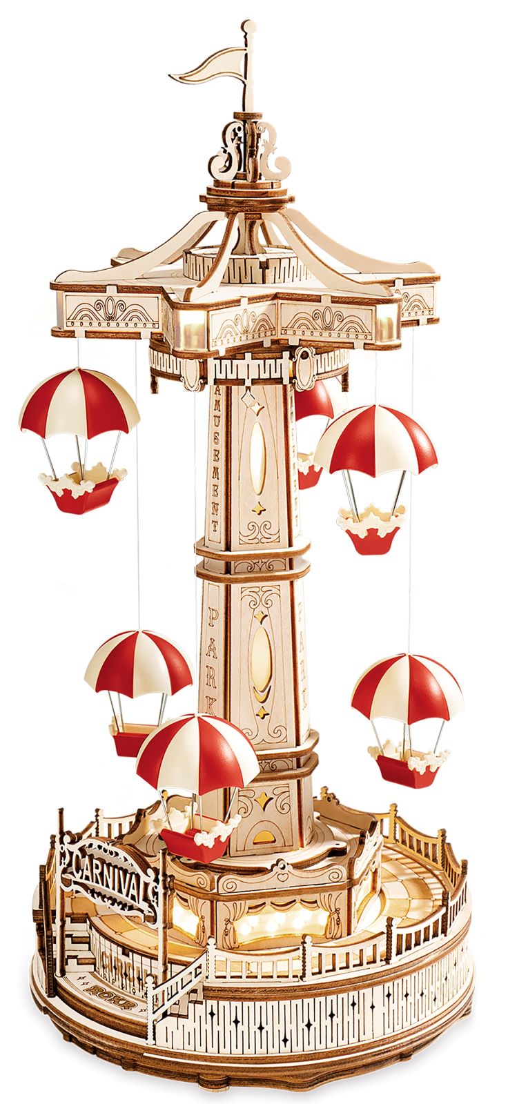 Die Fallschirme schweben auf diesem Karussel auf und ab, dazu gibt es Musik und Licht.. 184 Teile, Aufgebaut 14 x 14 x 30 cm, 14+, VE 1 Stk.