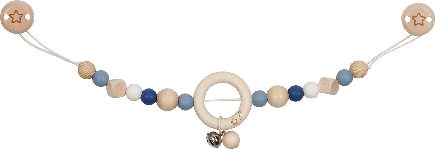 Diese Kinderwagenkette enthält hochwertige Silikonperlen, sie verleihen dem Spielzeug einen zusätzlichen haptischen Reiz und beim Zahnen hilft das Kauen auf den samtig weichen Perlen. Länge 40 cm, Holz, Silikon, VE 2 Stk.