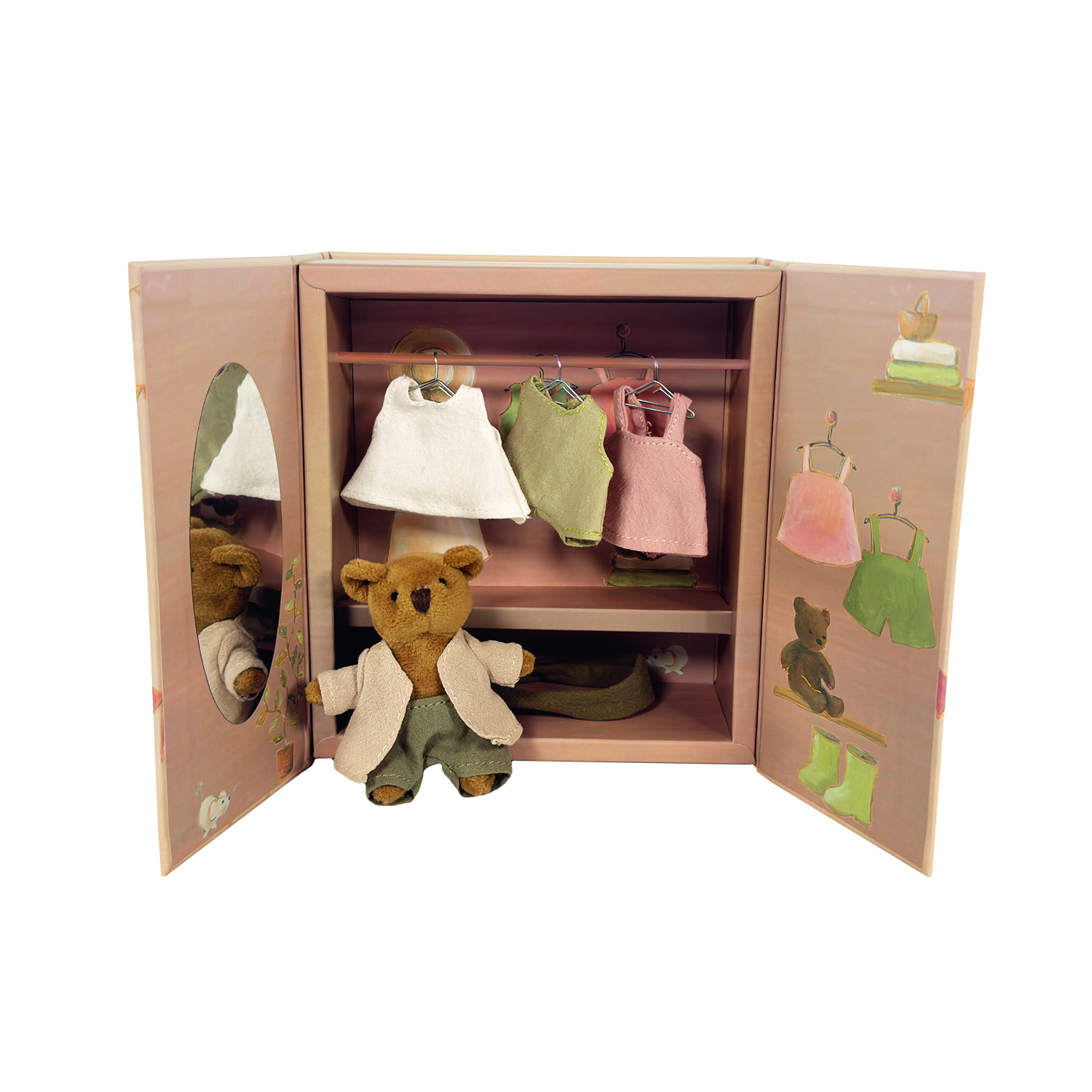 Ein süßer kleiner Bär und sein Kleiderschrank mit 6 Kleidungsstücken und Bügeln. Was wird er heute anziehen? Pappe, Plüsch, 18 x 16 x 6 cm, 4+, VE 2 Stk.
