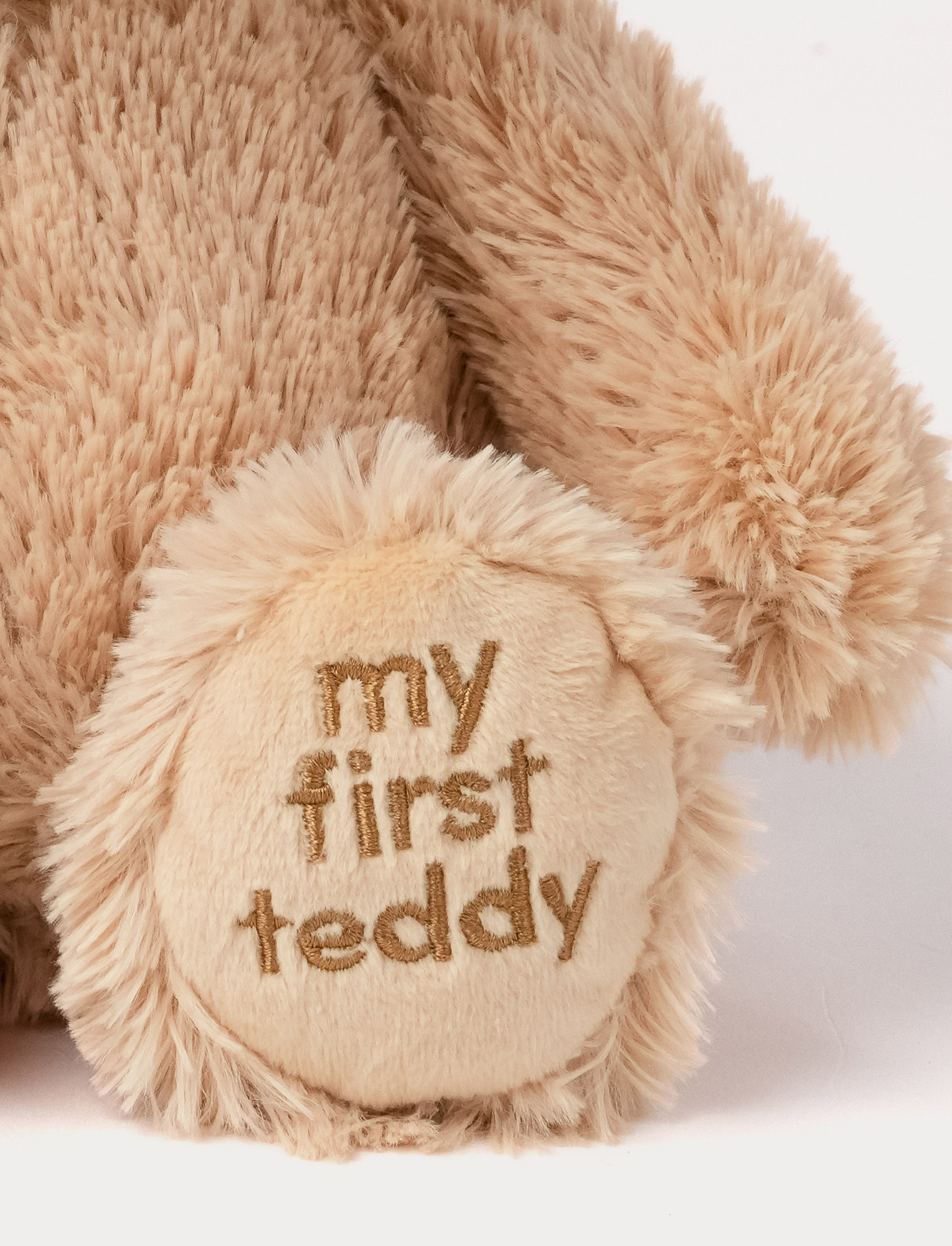 My First Teddy ist ein besonders weicher und kuscheliger erster Begleiter, der in einem warmen Beigeton mit gestickten Details gestaltet ist. Der Teddy kommt mit der englischen Stickerei „My First Teddy“. 28 cm, 0+, VE 2 Stk.
