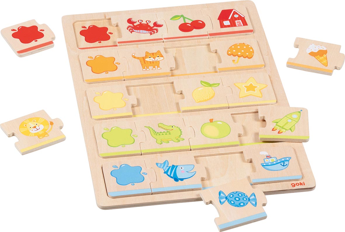 Das goki Puzzle dient dem Erlernen von Farben, wobei jede Farbe vier gleichfarbige Elemente zugeordnet sind, die aneinandergesetzt werden müssen. Holz, 20 Teile. 21 x 30 x 1 cm, 2+, VE 2 Stk.