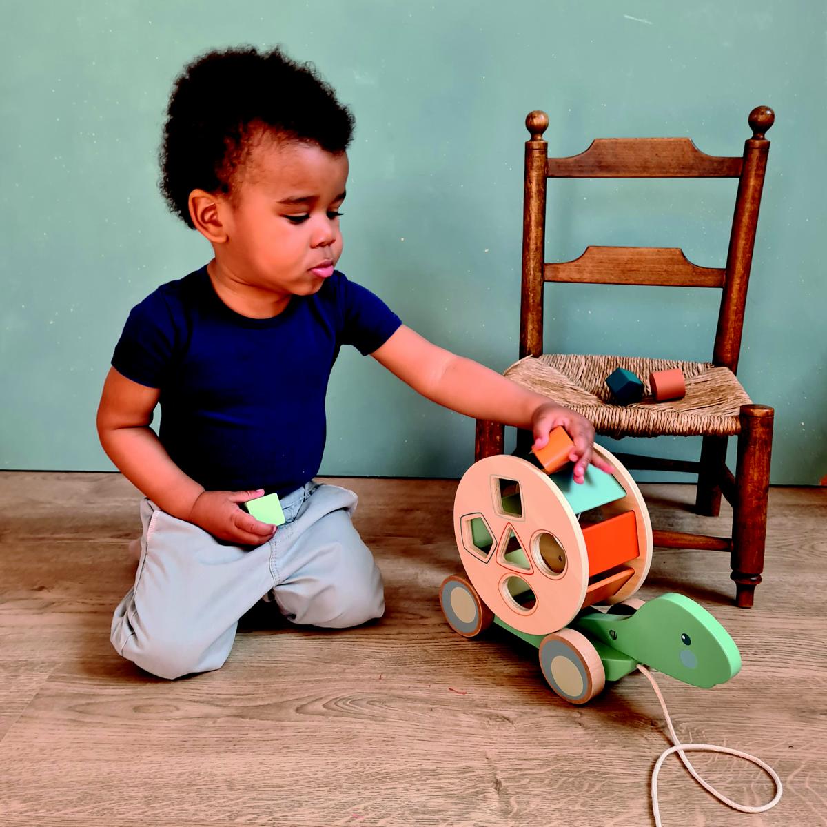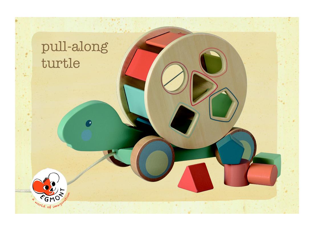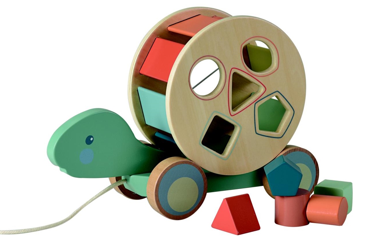 2 in einem. Lerne mit der nachziehbaren Schildkröte aus Holz zu laufen und lerne, die Formen in die richtigen Öffnungen zu stecken. Lehrreich und mit viel Spaß. 27 x 10 x 19 cm, 1+, VE 2 Stk.
