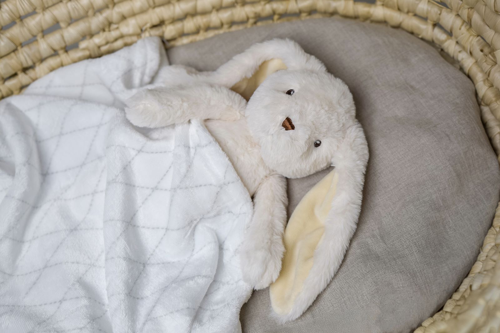 Ein wunderbares Set mit einer weichen und warmen Fleecedecke (100 x 75 cm) und einem kuscheligen Hasen. Der Stoff sowohl des Plüschtiers und der Decke sind aus aus OEKO-TEX® Material. Die Füllung des Plüschtiers besteht aus recycelten PET-Flaschen. Waschbar mit 40°. 0+, VE 1 Set