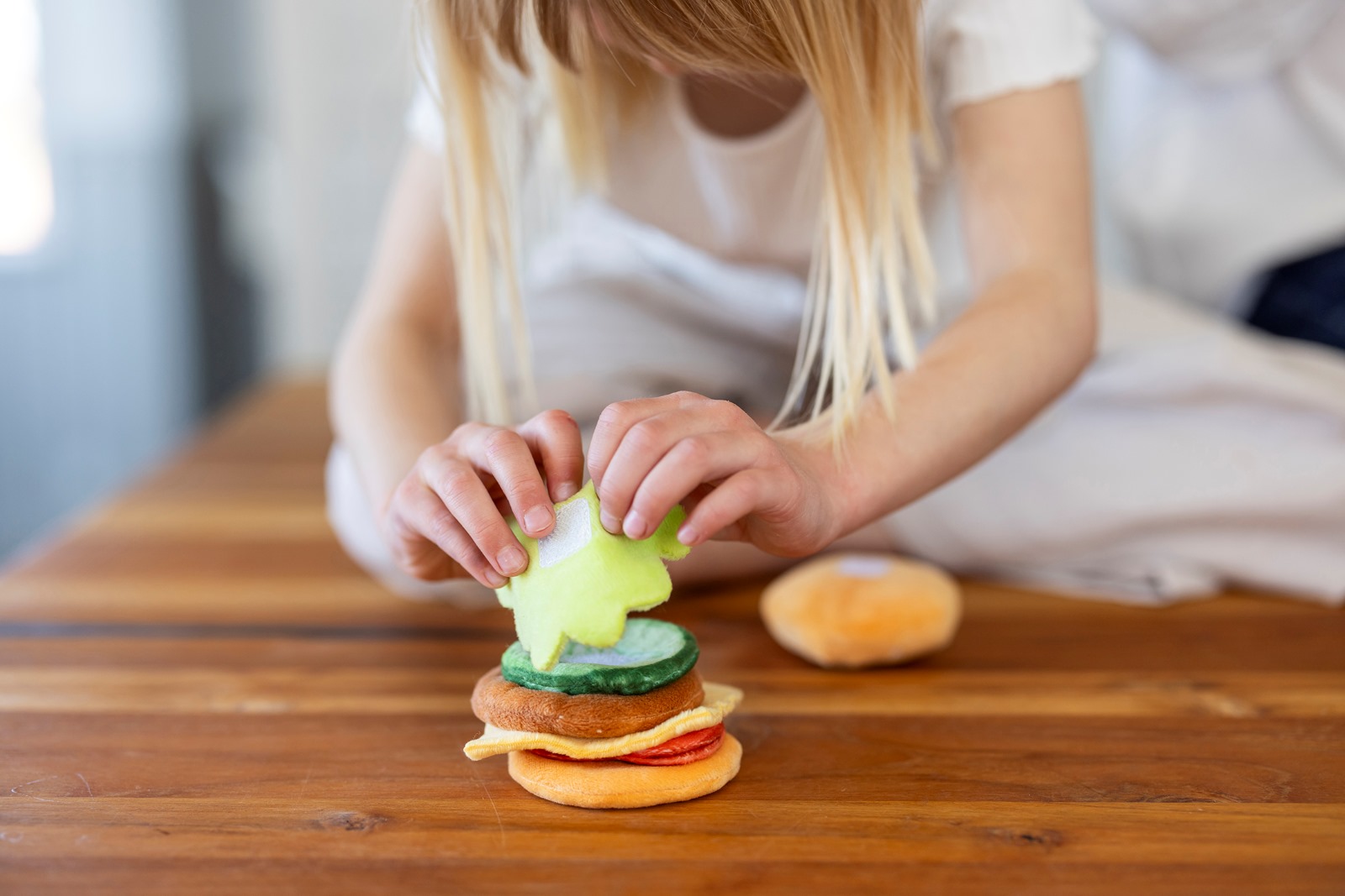 Dieses Spielset in einer schönen Tasche (mit Klettverschluss) enthält viele Leckereien, wie einen Hamburger mit Salat, Tomate, Käse, Gurke, eine Tüte Pommes Frites, und natürlich ein Getränk. Dies alles aus weichem, kuscheligen Plüsch, guten Appetit! Tasche 18 x 23 cm, 0+, VE 2 Stk.