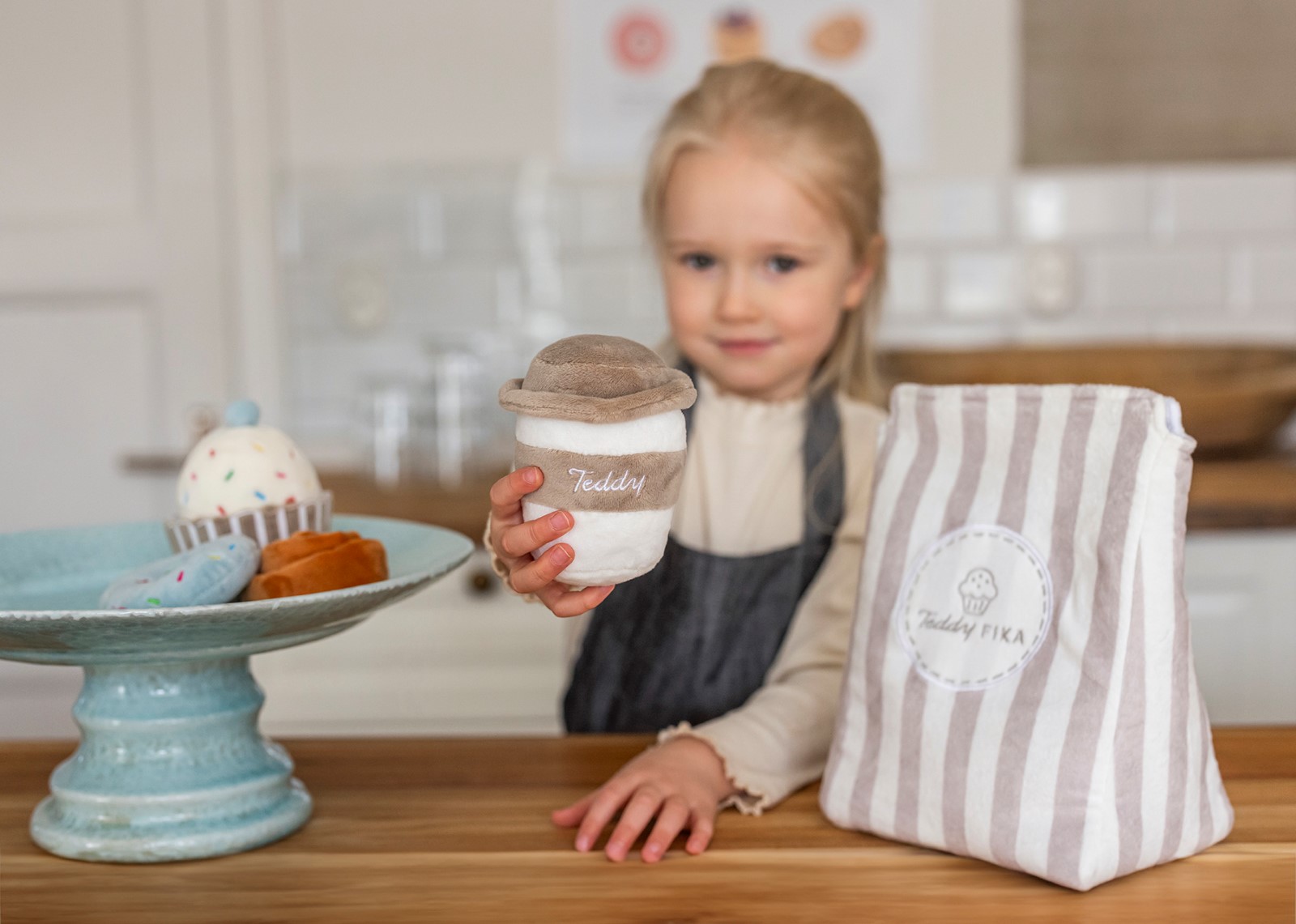 Dieses Spielset in einer schönen Tasche (mit Klettverschluss) enthält enthält eine Zimtschnecke, einen Donut mit Streuseln, einen großen Muffin mit Zuckerguss und Streuseln und der obligatorischen „Latte“. Tasche 18 x 23 cm, 0+, VE 2 Set
