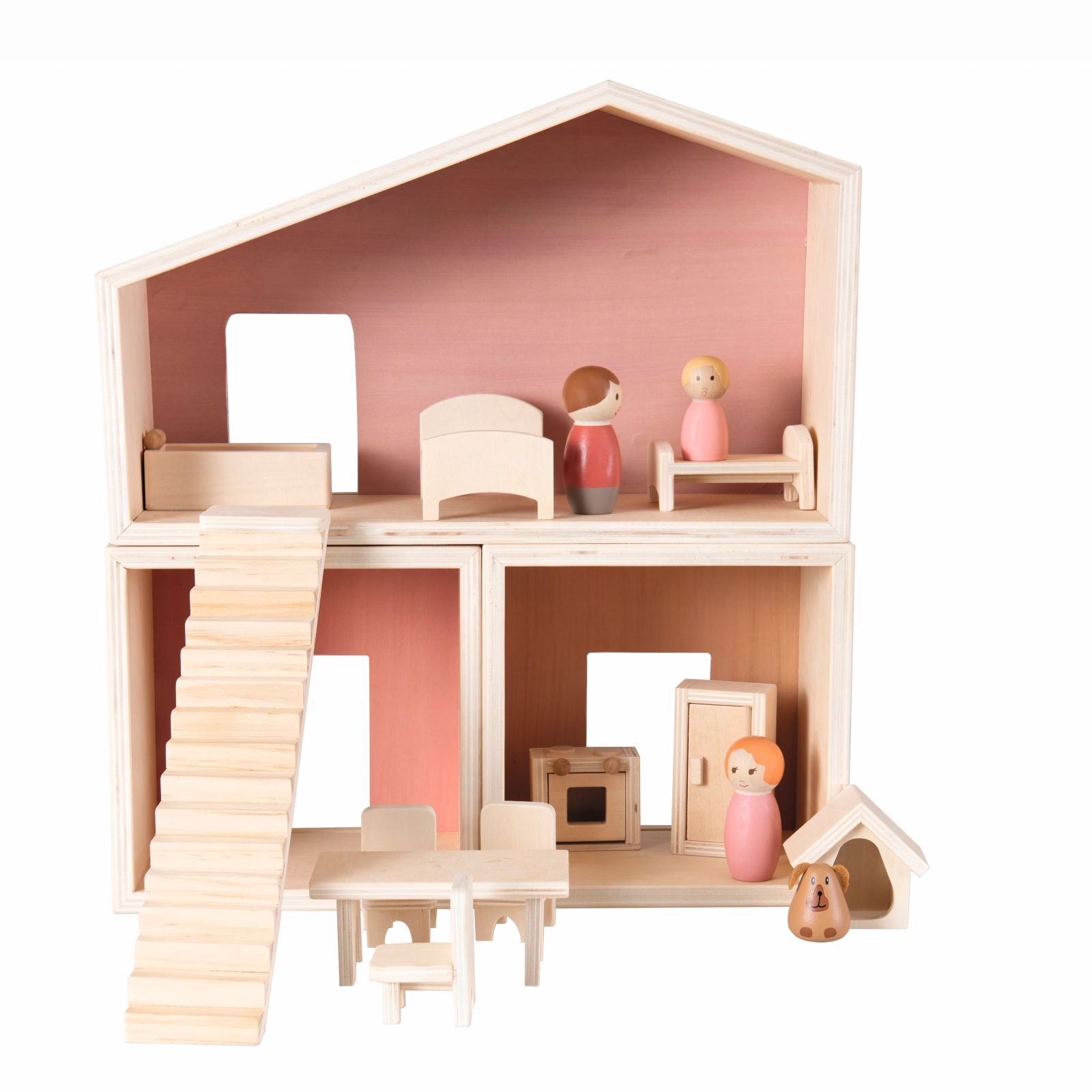 Dieses hübsche Puppenhaus aus Holz ist anpassungsfähig und kann je nach Fantasie zusammengestellt werden. Das Haus wird komplett mit der Familie und einem kompletten Möbelset geliefert. Stundenlanger Spielspaß garantiert. FSC zertifiziertes Holz. 30 x 35 x 11 cm (Verpackung), 18+ Monate, VE 1 Stk.