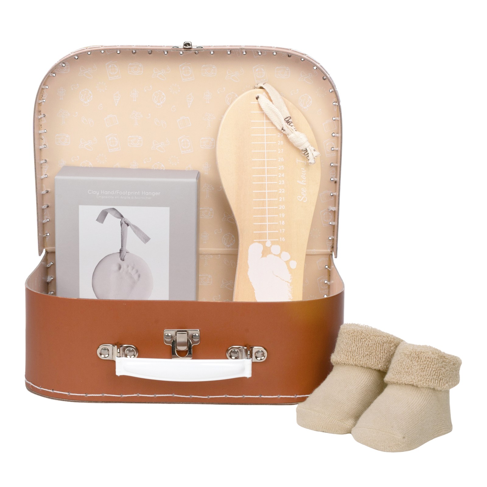 Schöner kleiner Koffer „Happy Feet” mit einem Set zum Erstellen eines Hand-/Fußabdrucks in Ton, Söckchen mit dem Text „dancing feet” und einem Maßstab, auf dem Sie die Schuhgröße Ihres Kindes notieren können. Was für ein schönes und originelles Geschenk! 25 cm, VE 1 Stk.