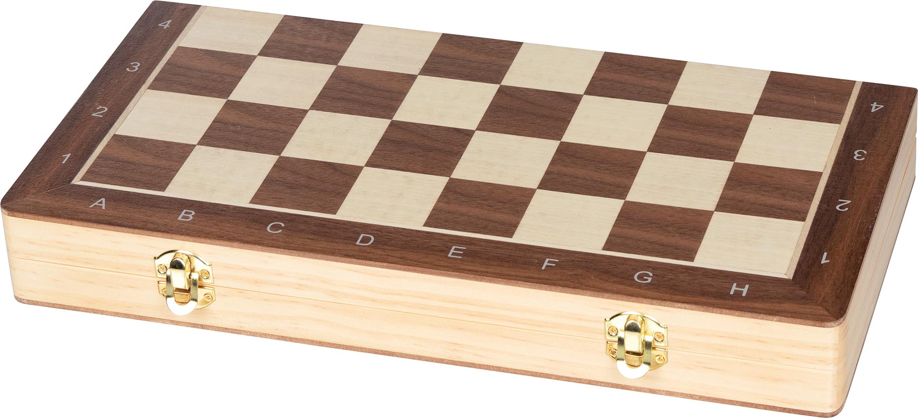 Ein sehr schönes Schach-/Dame Klappspiel, welches 2 Damen enthält, was eher selten der Fall ist. 38 x 38 x 2,5 cm, Feldgröße 4,2 x 4,2cm, 59 Teile, 7+, VE 1 Stk.