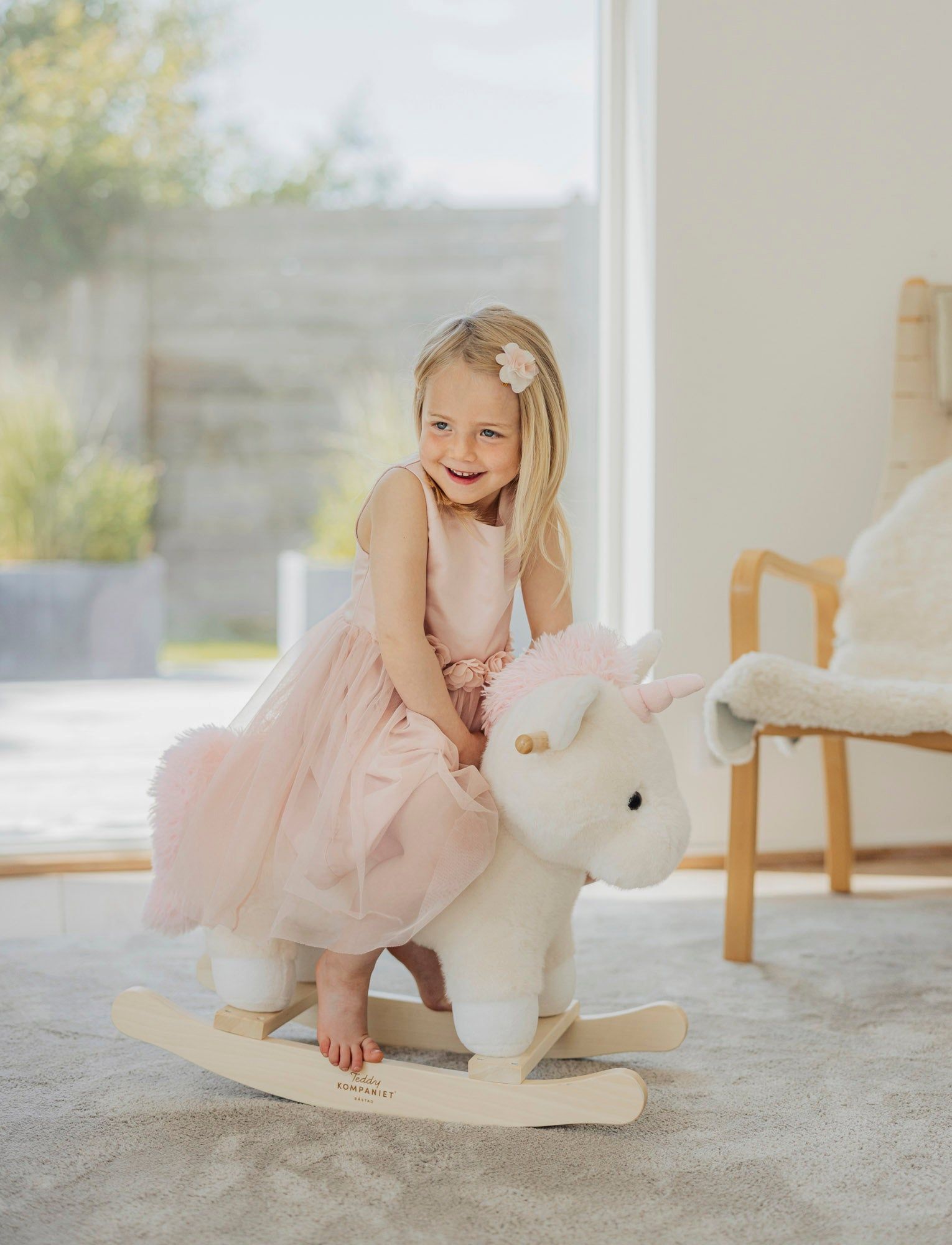 Dieses Schaukel-Einhorn ist ein kuscheliger Begleiter, der Kinder zum Spielen und Entdecken einlädt. Das Einhorn ist mit weichem Plüsch bezogen und hat einen gepolsterten Sitz für bequemes Reiten. Die stabilen Holzkufen und -griffe machen das Spielzeug sicher, robust und einfach zu handhaben. Maximalgewicht bis 50 Kg. 63 x 56 cm, 18 Mt.+, VE 1 Stk.