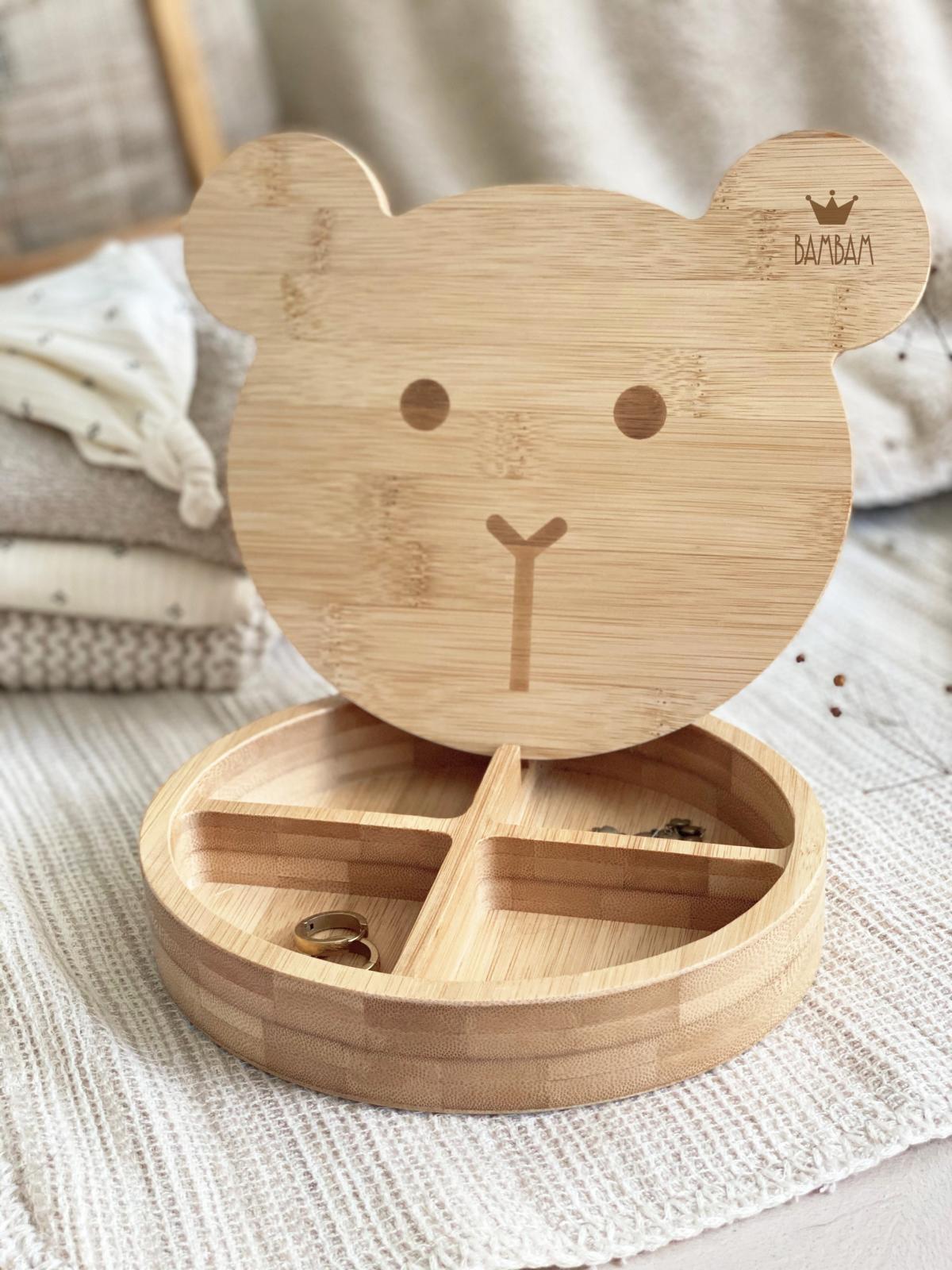 Sehr hübsche Schmuckdose aus Bambus mit Bärenkopfdeckel, 17 cm, VE 1 Stk.