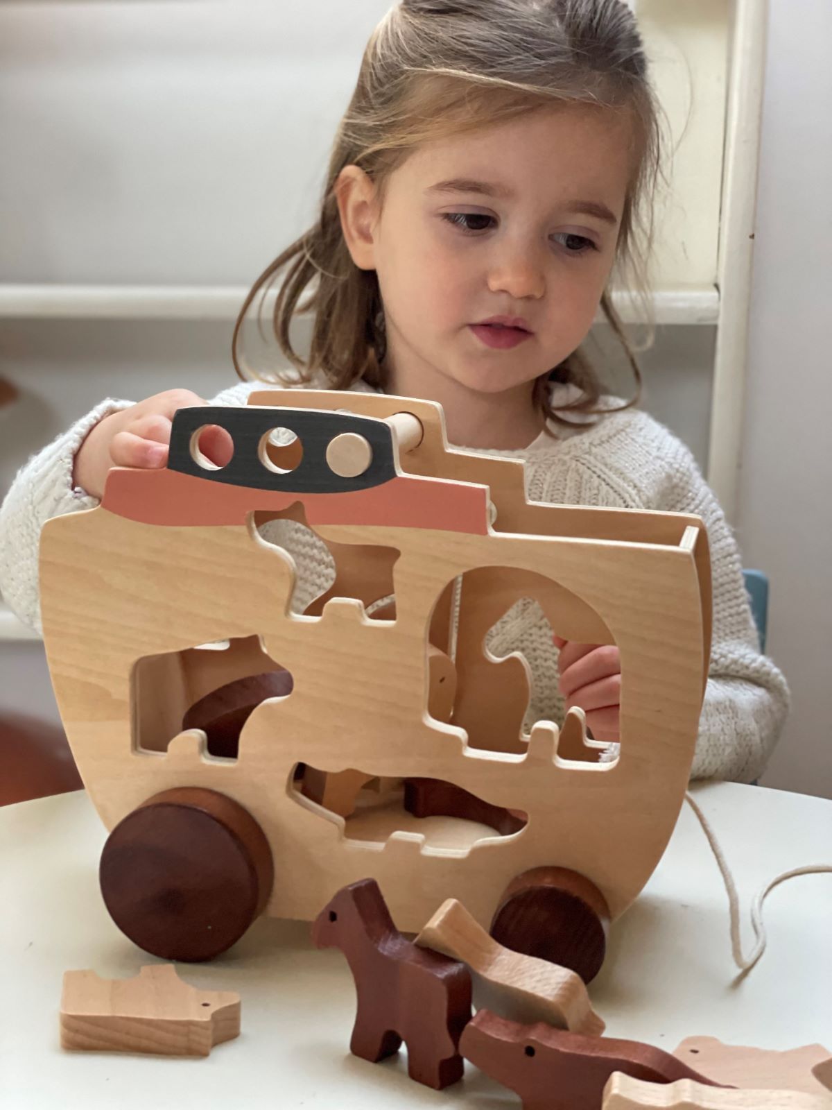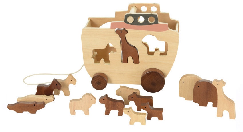 Finde die richtigen Öffnungen in Noahs Arche für die 14 Tiere. Wenn du das Boot ziehst, sieht es aus, als würde es auf den Wellen schwimmen. Ein großartiges pädagogisches Geschenk!aus aus FSC zertifiziertem Holz gefertigt. 24 x 12 x 20 cm, ab 18 Mt., VE 1 Stk.