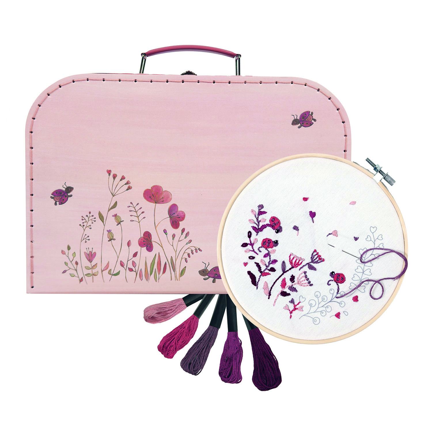 Baumwollstoff, Trommel, Schere, Nadel und Faden ... alles, was Sie brauchen, um eine schöne Marienkäfer-Stickerei zu machen. Verpackt in einem schönen Papp-Köfferchen. 29 x 20 x 10 cm, 7+, VE 2 Stk.
